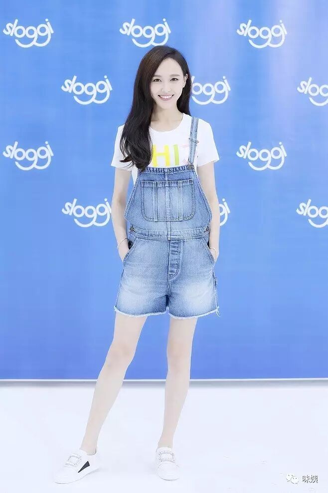 ▲王智一身休闲look元气满满,整套蓝白搭配清新自然,实力秀美腿,显少女活力。