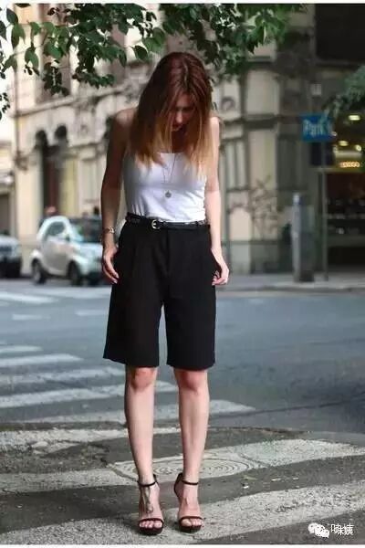 ▲背心+百慕大短裤,搭配高跟鞋,整体利落大方,帅气又不失性感,再炎炎夏日来件吊带衫可以更性感。