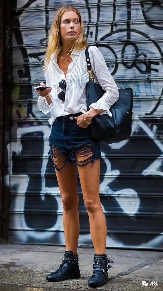 破洞牛仔短裤加入了破洞、烂边等元素,区别于基础款的一板一眼,让裤子显得更加的个性和不羁。 0 m3 R, x; v, V. z' m: v