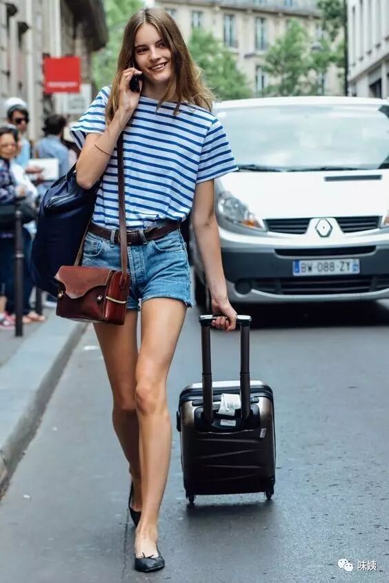 ▲蓝白条纹+蓝色短裤,给夏季带来一抹清凉。