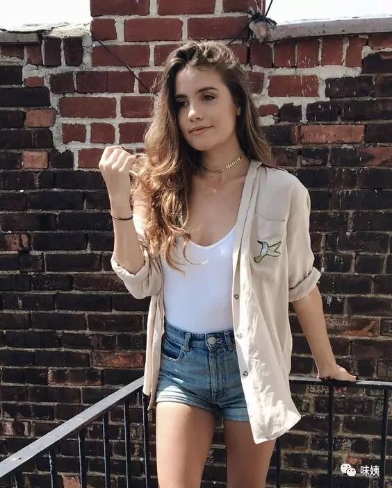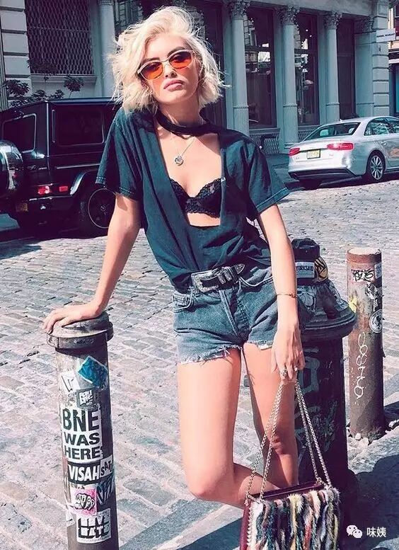 ▲修身上衣+毛边牛仔短裤,合身的上衣更显身材,毛边短裤制造出的立体感,也能更好的修饰身材的曲线。 3 U$ C# B) C- m+ w