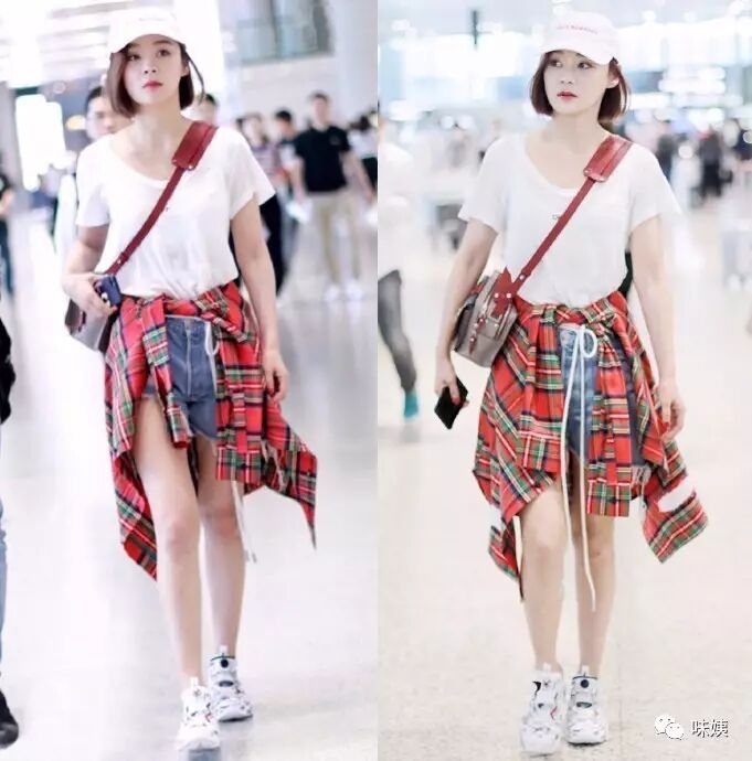 ▲袁姗姗 5月5日上海赴北京,身穿Off-White的T恤、短裤和格纹衬衫,将衬衫系在腰间的搭配有种叠穿的效果,提高了腰线,突出大长腿。 : z9 Z% t: R2 A7 R" I! M5 d7 W- l$ u