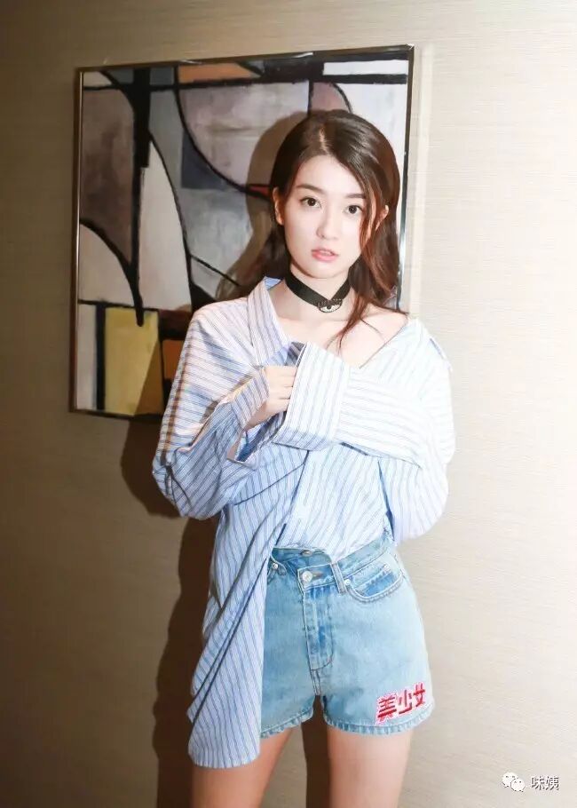 ▲欢乐颂2发布会造型look。乔欣轮廓衬衫+刺绣短裤,一身GROUND ZERO玩的是活力少女风,不对称的剪裁和美少女的标识,还有潮感十足的choker项圈,细节中彰显心机。这个“关关”有点酷~ ; x! b1 A0 P5 U. B