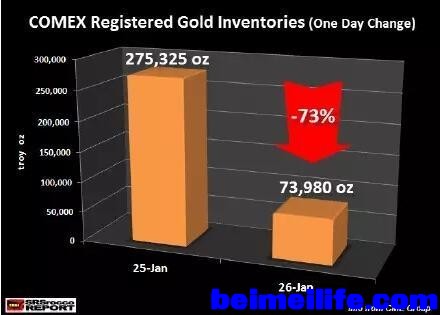 4 L% C! P( _6 B3 ~9 L: |2 A/ N 政经纵横谈独家消息获知,26日,美联储开始议息会议的当晚,纽约商品交易所的注册黄金库存,一夜之间,下降了73%,从27万盎司,下降到了7万盎司。接近7吨的黄金,被人提走。$ ]0 u+ f6 e/ ^9 R