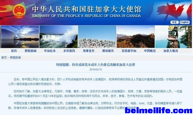 ! n. Y/ p: R9 A/ U* l$ D中国驻加拿大使馆特别提醒旅加中国公民,出境前详细了解加法律法规,文明守法,切勿在手机、电脑、Ipad、光盘、移动硬盘等存储介质下载、存储未成年人色情信息;如收到他人发送的上述信息,请随时删除,以免给自身带来不必要的麻烦或损失。