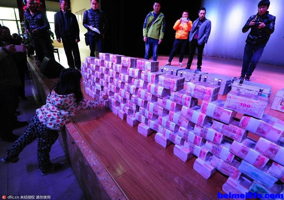 + {5 s( c$ I/ i! k2016年3月9日报道,昆明呈贡斗南七步场村当众发放分红1000万现金,羡煞旁人。图为3月7日,昆明呈贡斗南七步场却当众发放分红1000万现金,1000万分给几百人,人均数万,多的分的22万多,最少的大字不识的老太也有8000元。(摄影/YOUTUI)