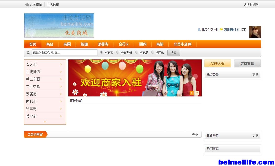 做为商业在线店铺形式, 欢迎各个品牌商家入驻, 同时商城与北美生活网的个人空间博客无缝结合,在北美生活网注册的网友,不仅会很方便地申请和构造个人风格的店铺, 而且自己在北美生活网博客/论坛所发表的文章/图片( 相册)都可以方便地引用到商城了,如店铺发展叫好, 我们还可以反过来, 将店铺推介到论坛板块以及门户频道。