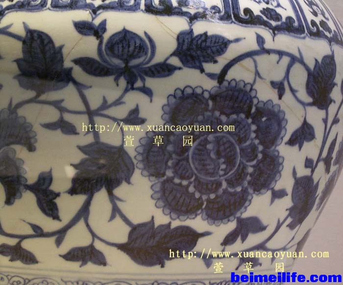 图9:自然界中的番莲。 3.宣德时期 永宣时期,景德镇的瓷器制作发展在历史上属于一个高潮,尤以宣德最为顶峰,无论是造型还是装饰绘画,宣青都继往开来。在永宣过渡时期,由于制品沿袭使用永乐造型和纹饰,永宣两朝制品差异不大,即人们常说的“永宣不分”,后来宣朝不断发展创新制品造型与装饰绘画,逐渐与永乐时期的制作风格产生差距。缠枝纹应算是两朝装饰绘画的一个缩影,宣德缠枝纹不少是沿用永乐时期的既成纹饰,的确许多器物很难一眼区分制作年代(图10、11)。 图10:宣德青花的转枝莲纹碗。北京故宫藏品。继承使用永乐的缠枝纹饰。' g q1 v" T3 Z2 a0 }" i6 K# [